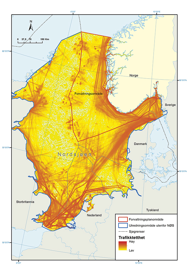 Skipstrafikken i Nordsjøen og Skagerrak har større omfang og er mer kompleks enn i de andre norske havområdene. Figur 4.4 viser at sørlige del av planområdet har svært tett skipstrafikk, og 3/4 av skipstrafikken i Nordsjøen foregår utenfor norsk økonomisk sone. Stykkgodsfartøy og produkttankskip (olje og/eller kjemikalieskip) står for henholdsvis 22 % og 11 % av total utseilt distanse i utredningsområdet. De større skipene (over 5000 bruttotonn) står for en større andel av utseilt distanse utenfor norsk økonomisk sone enn innenfor. De aller største skipene (over 50000 bruttotonn) besøker i liten grad norske havner.