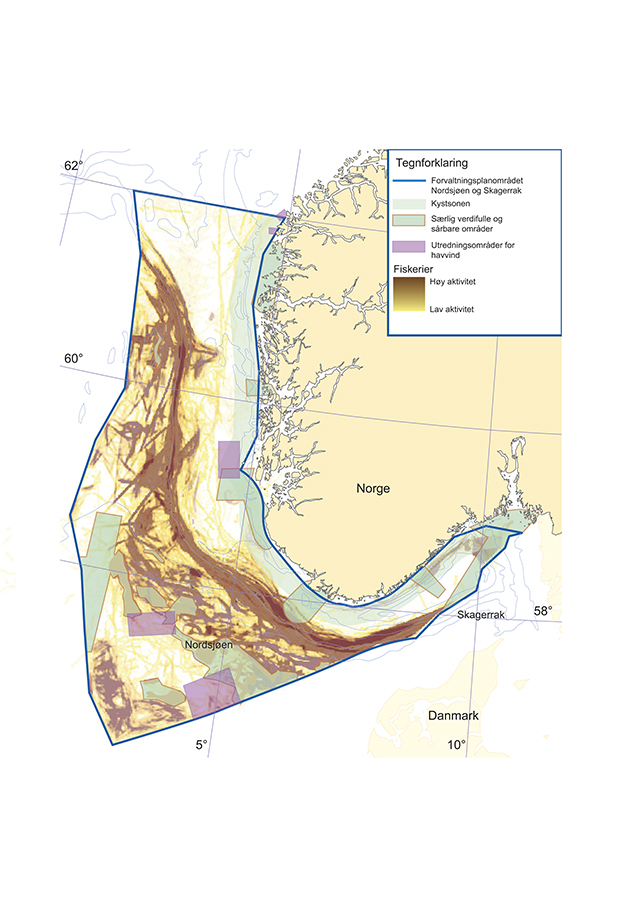 Figur 5.3 Fiskeriaktivitet og utredningsområder for havvind i Nordsjøen og Skagerrak