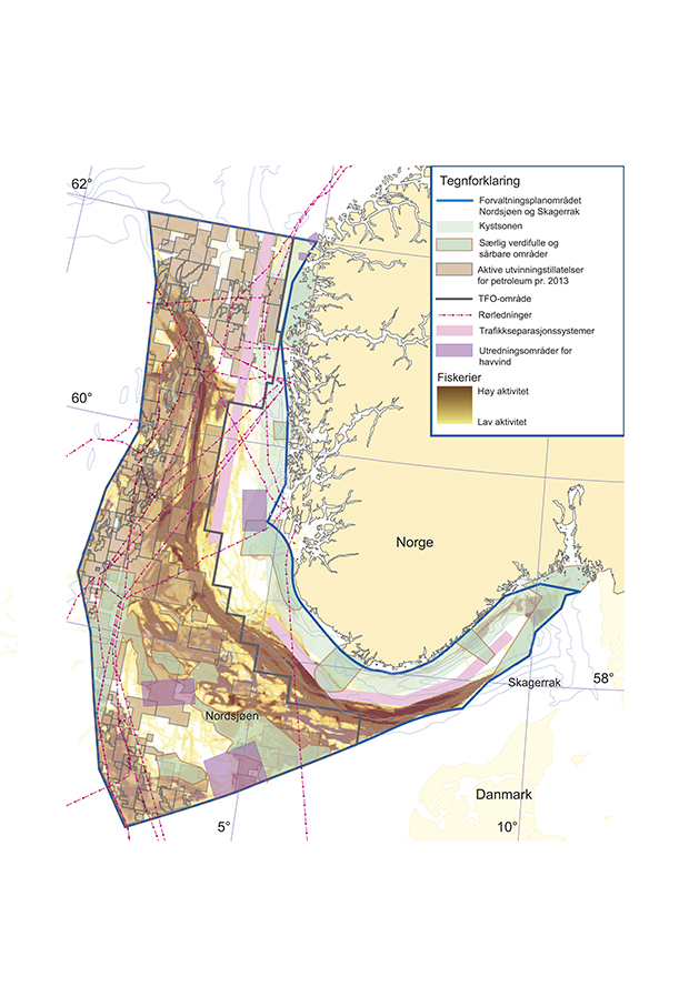 Hovedtema for dette kapitlet er utfordringene knyttet til overlappende arealbehov mellom næringsvirksomhet som petroleumsvirksomhet, fiskerier, skipstrafikk og havvind. Arealvurderinger knyttet til balansen mellom bærekraftig bruk og opprettholdelse av økosystemet behandles i kapittel 3, 6 og 7. Allerede St. meld. nr. 12 (2001–2002) Rent og rikt hav omtalte at den forventede økningen i bruken av kyst- og sjøarealene vil stille store krav til avveininger mellom ulike brukerinteresser og miljøhensyn, og at planlegging i sjøområdene vil være et viktig virkemiddel i denne sammenheng. En differensiert og bærekraftig arealforvaltning må baseres på kunnskap om økosystemet og konsekvensene av ulik bruk. I forvaltningsplanene er areal- og kartbaserte verktøy i betydelig grad benyttet for å illustrere ulike typer bruk, beskyttelse og vern i de enkelte havområder.