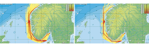 I en rapport fra Kystverket beregnes miljørisiko knyttet til akutt oljeforurensning fra skipstrafikken langs kysten av Fastlands-Norge for 2008 og prognoser for 2025. Her fremgår det at beregnet miljørisiko for både sjøfugl, strandhabitater og fisk er høyere i Nordsjøen og Skagerrak enn i andre norske havområder. De mulige konsekvensene er i hovedsak mer alvorlige i nord. På grunn av høyere utslippssannsynlighet som følge av langt mer omfattende trafikk, beregnes likevel miljørisikoen som høyere i sør. Kystområdene fra svenskegrensen til Lindesnes er i tillegg utsatt for et betydelig risikobidrag fra svensk og dansk skipstrafikk. Tankbåttrafikken langs kysten av Danmark er stor og drivbaneberegninger som er foretatt viser en betydelig sannsynlighet for at eventuelle utslipp vil kunne nå norske kystområder. Lang drivtid på sjøen vil imidlertid føre til forvitring av oljen som igjen vil redusere eventuelle miljøkonsekvenser på norsk side.