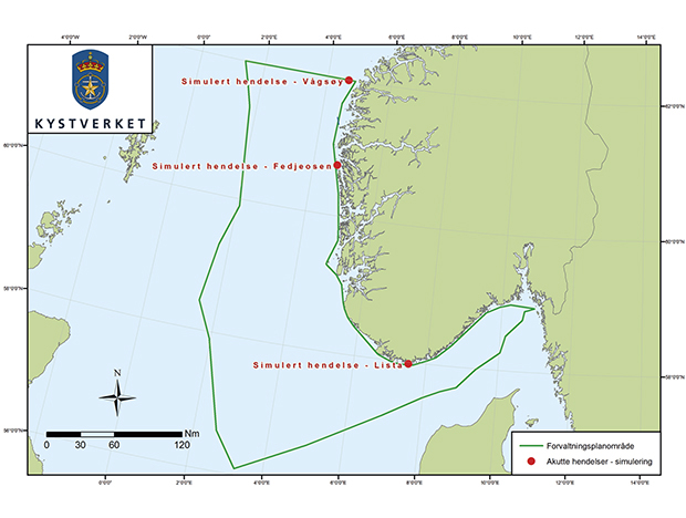 De simulerte hendelsene skjer ved henholdsvis Lista 10. januar, Fedjeosen 25. mai og Vågsøy 11. mars, med utslipp på henholdsvis 2 700 tonn bunkers og 100 m3 marin diesel, 27 000 tonn råolje og 500 m3 bunkers og 120 000 tonn råolje. Den simulerte hendelsen ved Vågsøy er ekstrem både i omfang og varighet, og må betegnes som et «worst case» scenario. Selv der en stor oljetanker er involvert, fører det svært sjeldent til utslipp av en slik størrelse. Hendelser av et slikt omfang er svært sjeldne, og vi har ingen eksempler på utslipp i nærheten av denne størrelsen i Norge. Utslippet er også langt større enn hva Kystverket tar utgangspunkt i ved dimensjonering av statlig oljevernberedskap.