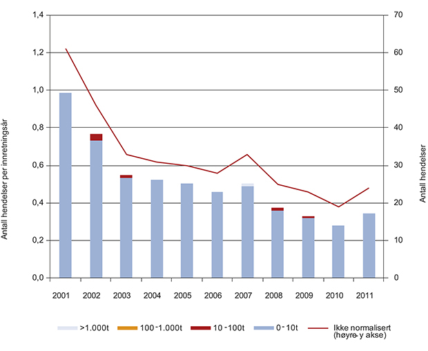 I Nordsjøen har det samlet sett i perioden 2001–2011 vært en tydelig reduksjon av antall akutte råoljeutslipp per år og per innretningsår, jf. figur 6.4. Det er store variasjoner når det gjelder mengder olje på sjø som følge av disse hendelsene. Størrelsen på de inntrufne akutte råoljeutslippene i perioden domineres i betydelig grad av noen få store enkeltutslipp. Mens de aller fleste akutte utslippene har vært på mindre enn 10 tonn, har de største vært på henholdsvis 3700 tonn (Statfjord A, 2007) og 80 tonn (Statfjord C, 2009).