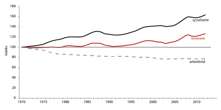 Gjennomsnittlig arbeidstid per uke har gått ned med mer enn 20 prosent siden begynnelsen av 1970-tallet. Særlig på 1970-tallet var nedgangen i gjennomsnittlig arbeidstid kraftig. De siste ti årene har det vært tegn til stabilisering. En konsekvens av lavere gjennomsnittlig arbeidstid er mindre økning i arbeidstilbudet enn det veksten i antall sysselsatte isolert sett skulle tilsi. Utførte timeverk har like fullt vokst med om lag 25 prosent siden begynnelsen av 1970-tallet, jf. figur 2.1.