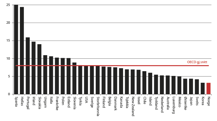 Figur 2.10 Arbeidsledighet i OECD-landene, prosent 2012