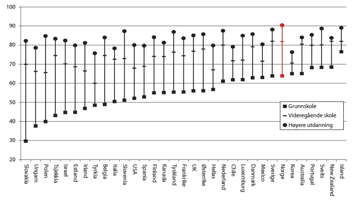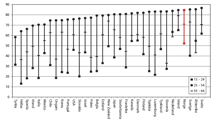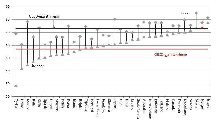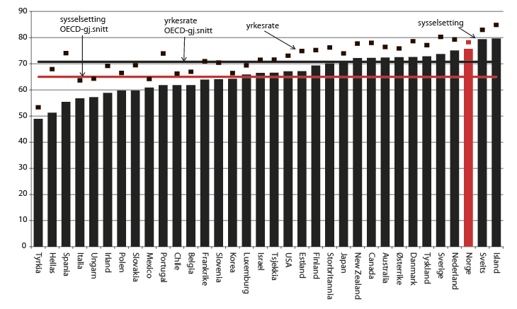 Sysselsettingen er gjennomgående høy i de fleste gruppene i Norge, sammenliknet med det som er situasjonen i mange andre land. Sysselsettingsandelen ligger godt over OECD-gjennomsnittet både for kvinner og menn, unge og eldre aldersgrupper, lavt og høyt utdannede, innenlandsfødte og utenlandsfødte. Sysselsettingen er spesielt høy blant kvinner, eldre arbeidstakere og personer med høyere utdanning, sett i et internasjonalt perspektiv. Sysselsettingen for kvinner i Norge ligger for eksempel på nivå med den gjennomsnittlige sysselsettingen blant menn i OECD-området, jf. figur 2.13.