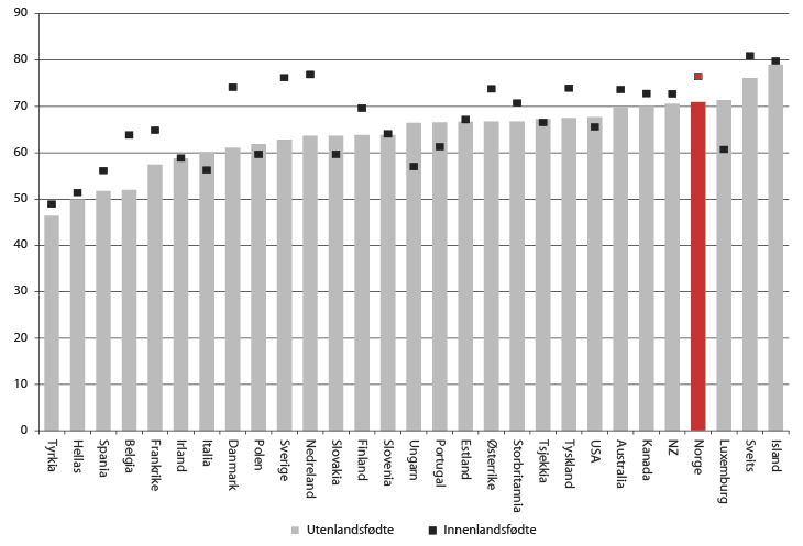 Det er store forskjeller innad i innvandrerbefolkningen. Sysselsettingsraten blant innvandrere fra EØS-området er høy og ligger samlet sett noe over sysselsettingen i befolkningen eksklusive innvandrere. Dette gjelder særlig personer fra Norden, men også personer fra EU-land i Øst-Europa. Dette skyldes i stor grad at arbeidsinnvandrere dominerer i disse gruppene og at de er overrepresentert i de mest arbeidsføre aldersgruppene. Sysselsettingen blant innvandrere fra Asia og Afrika er betydelig lavere, med henholdsvis 55 og 43 pst. Dette kan delvis forklares med at en større del av disse er flyktninger enn i andre grupper. Forskjellene mellom majoritetsbefolkningen og innvandrere blir større når en tar hensyn til at innvandrere i Norge har en alderssammensetning som gjør at de er overrepresentert i de aldersgruppene som generelt har høy sysselsetting. Brochmannutvalget (NOU 2011: 7) har vist at sysselsettingen også for arbeidsinnvandrere fra EØS-land ligger lavere enn hos majoritetsbefolkningen når en tar hensyn til forskjellene i kjønns- og alderssammensetning.