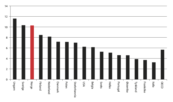 Økt tilstrømming til offentlige ytelser er ikke et særnorsk fenomen, men Norge har en høy andel mottakere av ytelser sammenliknet med andre industrialiserte land, spesielt andelen som mottar helserelaterte ytelser. Figur 2.18 sammenlikner andelen som mottar uføreytelser i ulike land. I 2008 hadde Norge den tredje høyeste uføreandelen av 28 OECD-land, om lag dobbelt så høy som gjennomsnittet. Dette mønsteret gjenspeiles også i sykefraværsstatistikken, hvor Norge lå høyest av samtlige land med nær 7 prosent sykefravær i 2010.