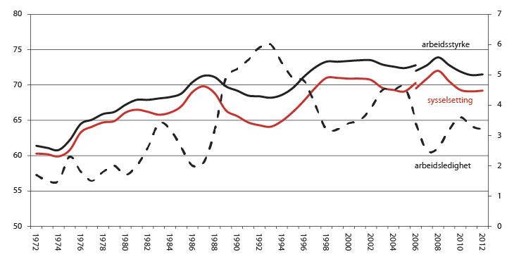 Reduksjonen i gjennomsnittlig arbeidstid har skjedd både gjennom redusert normalarbeidstid for heltidsarbeidere, gjennom at flere har kommet inn i arbeidslivet men jobber deltid og i noen grad også gjennom økt midlertidig fravær. Økningen i antallet som jobbet deltid etter 1970 må ses i sammenheng med kvinnenes økte yrkesaktivitet. Reduksjon i normalarbeidstiden har skjedd dels gjennom reduksjon i gjennomsnittlig ukentlig arbeidstid og dels gjennom økning i antall feriedager. I 1986 ble normalarbeidsdagen satt ned fra 40 til 37,5 timer i virksomheter med tariffavtale, og tariffoppgjøret i 2000/2001 ga mange grupper en femte ferieuke. Kortere normalarbeidsdag gir lavere arbeidstilbud, og er et uttrykk for bedringer i velferden for arbeidstakere over de senere tiårene. Befolkningen ønsker normalt mer fritid etter hvert som velstandsnivået øker. Økt midlertidig fravær kan dels tilskrives økt omfang av ferie og permisjoner, som for eksempel foreldrepermisjon, som er en klar velferdsforbedring for barn og småbarnsforeldre, men kan også i perioder dels tilskrives økning i sykefraværet. Figur 2.1 Utvikling i antall sysselsatte, utførte timeverk og arbeidstid, 1970–2012.1 Indeksert, 1970=100 1 Arbeidstid er beregnet som timeverk dividert på antall sysselsatte. Kilde: Statistisk sentralbyrå, Nasjonalregnskapet Figur 2.2 Deltakelse i arbeidslivet: Arbeidsstyrke og sysselsatte i prosent av befolkningen i yrkesaktiv alder (venstre akse) og arbeidsledige i prosent av arbeidsstyrken (høyre akse), 1972–2012.1 1 Det skjedde en større omlegging av AKU fra januar 2006. Befolkningen i yrkesaktiv alder ble blant annet endret fra 16-74 til 15-74 år. Samtidig ble aldersdefinisjonen endret fra alder ved utgangen av året til alder på referansetidspunktene for undersøkelsen. Kilde: Statistisk sentralbyrå, Arbeidskraftundersøkelsen