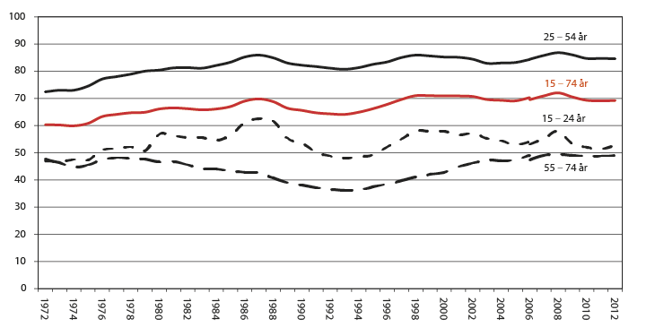 Samtidig ønsker Regjeringen å legge til rette for mer gradering i de helserelaterte ytelsene, og at mer av den gjenværende arbeidsevnen skal kunne utnyttes i det ordinære arbeidslivet, jf. kapittel 4. Det vil isolert sett føre til mer deltid i arbeidslivet samtidig som samlet arbeidsinnsats øker. Figur 2.4 Sysselsettingsrate etter alder, prosent 1972–2012 Kilde: Statistisk sentralbyrå, Arbeidskraftundersøkelsen