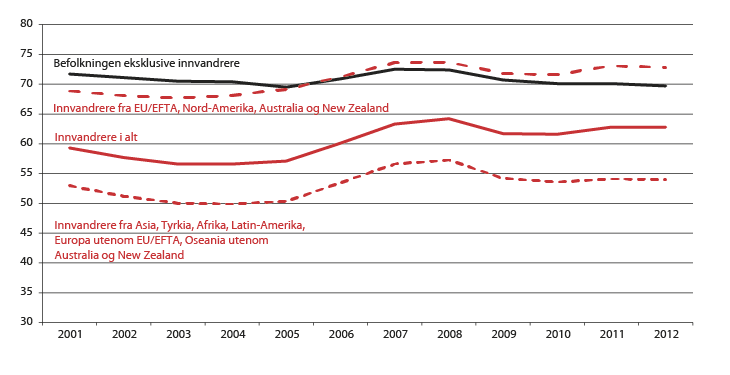 Det er relativt store og vedvarende forskjeller i tilknytningen til arbeidsmarkedet mellom ulike grupper innvandrere og befolkningen for øvrig. Sysselsettingen for befolkningen eksklusive innvandrere (15-74 år) var i 4. kvartal 2012 70 prosent, sammenliknet med 63 prosent for innvandrere.