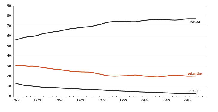 Ulike næringer og bransjer opplever ulik vekst i sysselsettingen over tid. I Norge, som i andre industriland, flytter arbeidskraft over tid fra vareproduserende til tjenesteytende næringer. Andelen av de sysselsatte som jobber i primærnæringene (jordbruk, skogbruk og fiske) er kontinuerlig redusert over tid, jf. figur 2.6. I dag er det under 3 prosent av de sysselsatte som jobber i primærnæringene. Andelen som jobber i sekundærnæringene (industri, strøm- og vannforsyning og bygg og anlegg) ble særlig mye redusert i perioden 1975–1990. Etter 1990 har andelen som er sysselsatt i sekundærnæringene, holdt seg stabil. I dag står sekundærnæringene for 20 prosent av sysselsettingen. Motsatsen til at vareproduserende næringene er blitt bygget ned, er en tilsvarende vekst i tertiærnæringer (tjenesteytende næringer). I dag er 77 prosent av de sysselsatte i tertiærnæringer.