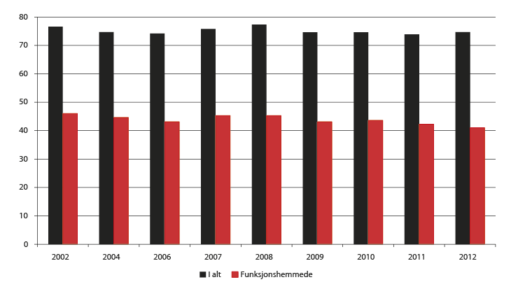 Statistisk sentralbyrå gjennomfører hvert år en tilleggsundersøkelse i AKU om funksjonshemmede. Undersøkelsen omfatter personer som oppgir å ha fysiske eller psykiske helseproblemer av varig karakter, jf. nærmere omtale av begreper i boks 2.3. Om lag 15 prosent av utvalget i alderen 15-66 år oppga i 2012 å være funksjonshemmet, noe som tilsvarer 521 000 personer i hele befolkningen. Andelen har holdt seg nokså stabil over tid.