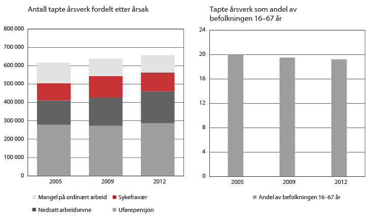 Figur 2.9 viser antall tapte årsverk for utvalgte år.19 Fra 2005 til 2012 økte antall tapte årsverk med nær 7 prosent, fra 616 000 til 657 000. Denne veksten må ses i sammenheng med demografiske endringer. Dersom befolkningen ikke hadde endret seg i perioden ville vi ha observert en nedgang på 30 000 i samme periode.20 Samtidig får befolkningen et stadig høyere utdanningsnivå som isolert sett skulle gi et lavere antall mottakere av helserelaterte ytelser.21 I perioden 2005 til 2012 har vi sett en økning i antall tapte årsverk knyttet til nedsatt arbeidsevne, mens det i samme periode har vært en nedgang i antall tapte årsverk knyttet til mangel på arbeid. Se kapittel 4 for en nærmere diskusjon av utviklingen i mottakere av helserelaterte ytelser.