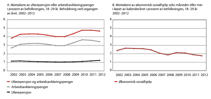 Nær 10 000 personer under 30 år mottok uførepensjon i 2012. I tillegg mottok om lag 27 500 personer under 30 år arbeidsavklaringspenger samme år. Totalt mottok nær fem prosent av unge i alderen 18-29 år uførepensjon eller arbeidsavklaringspenger i 2012, jf. figur 6.1.1 Om lag 13 800 personer under 30 år mottok økonomisk sosialhjelp seks måneder eller mer i løpet av 2012, enten i form av supplerende stønad eller som hovedkilde til forsørgelse. Det er mange unge blant sosialhjelpsmottakerne.
