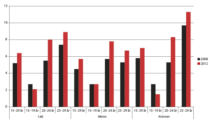Samlet har andelen unge utenfor opplæring og arbeid økt med om lag ett prosentpoeng fra 2008 til 2012 for aldersgruppen 15-29 år. I samme periode økte denne andelen i aldersgruppen 25-29 år med halvannet prosentpoeng til ni prosent, mens den økte med 2,5 prosentpoeng til åtte prosent i gruppen 20-24 år. Blant 15-19-åringene har andelen vært relativt stabil fra 2008 til 2012. Unge i 20-årene ser med andre ord ut til å være konjunkturfølsomme med hensyn til å gå ut av og inn i passivitet, mens andelen 15-19-åringer utenfor opplæring og arbeid i liten grad påvirkes av konjunkturene. I denne gruppen er omfanget av passivitet langt mindre, men ser ut til å være et strukturelt fenomen, som også påpekt av tidligere forskning.5