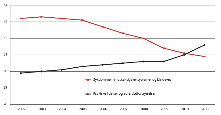 I perioden 2000–2011 økte det legemeldte fraværet som er knyttet til psykiske lidelser med 20 prosent.30 Lettere psykiske lidelser økte med 145 prosent i perioden, og samtidig var det en betydelig reduksjon i depressive tilstander, mens angstlidelser var tilnærmet uendret. Alvorlige psykiske lidelser svarer for en svært lav del av sykefraværet og falt i perioden 2000–2011. Aldersgruppene under 50 år sto for hele økningen i legemeldt fravær grunnet psykiske lidelser.