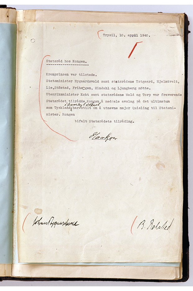 Kjelde: Foto og kjelde: Riksarkivet. Referanse: Statsrådssekretariatet, Kgl. res. 1940, nr. 1b. Originalen er i Riksarkivet.