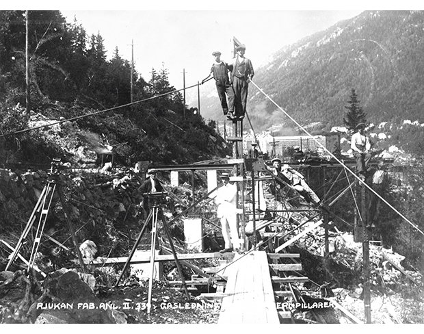 Figur 2.2 Rjukan, montering av jarnpilarar langs gassrøyr, 1914.