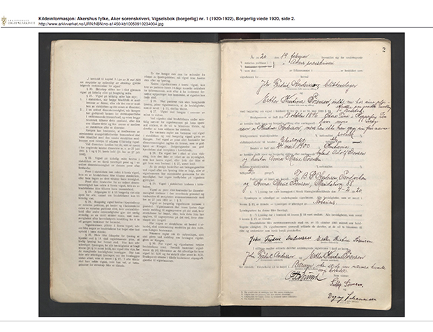 Kjelde: Foto og kjelde: Riksarkivet. Akershus fylke, Aker sorenskriveri, Vigselsbok (borgerlig) nr. 1 (1920 – 1922), Borgerlig viede 1920, side 2.