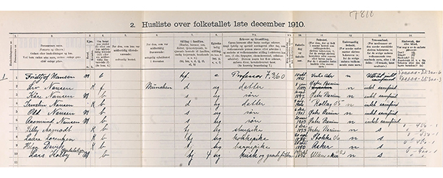 Figur 2.9 Frå Digitalarkivet. Husliste frå folketeljinga 1. desember 1910. Den viser bebuarane på Polhøgda ved Lysaker: Fridtjof Nansen, hans fem barn og ein tenarstab på fire.