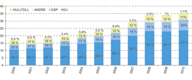 Slik det går fram av figur 4.1 har verdien av importerte matvarer, målt i verdi, økt fra om lag 16 mrd. kroner i 2000 til om lag 35 mrd. kroner i 2010. Viktige importvarer er vin, bakverk, tilberedte næringsmidler, sukker, sjokolade, soyabønner, dyrefôr og sydfrukter. I underkant av 70 pst. av importen kommer fra EU med Danmark og Sverige som de to største eksportlandene. Rundt 20 pst. av importen kommer fra GSP-land (u-land), der Brasil er dominerende. Av importen kommer 1 pst. fra de fattigste 64 landene.