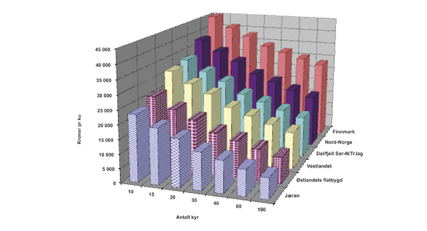 Figur 4.19 gir en illustrasjon på distrikts- og strukturprofilen i de direkte tilskuddene til melkeproduksjon. Illustrasjonen er gjort på kalkylebasis og omfatter de løpende rettighetsbaserte tilskuddene til melkeproduksjon, regnet per ku ved økende driftsomfang og i ulike områder.
