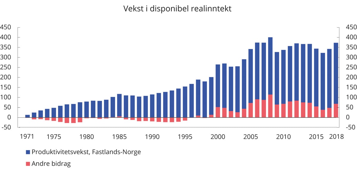 Når velstandsnivået i Norge er høyere enn i de fleste andre land, er det blant annet fordi vi bruker ressursene i økonomien på en effektiv måte. Ved å bli mer effektive får vi flere og bedre varer og tjenester ut av ressursene vi benytter. Et vanlig mål på effektivitet i produksjonen er arbeidsproduktivitet, som måler hvor mye vi får igjen for hver arbeidstime. Mer enn fire femdeler av velstandsøkningen siden 1970 er knyttet til økt arbeidsproduktivitet i fastlandsøkonomien, se figur 5.1. Bidraget fra andre faktorer, som økte priser på olje, har hatt langt mindre betydning.