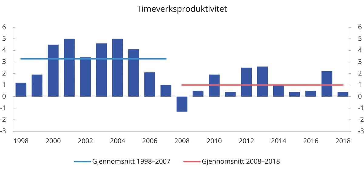 Produktiviteten i Norge har vokst saktere siden den globale finanskrisen. I markedsrettede næringer i Fastlands-Norge falt gjennomsnittlig årlig vekst i arbeidsproduktivitet fra 3,3 prosent i perioden 1998–2007 til 1 prosent i årene fra 2008 til 2018, se figur 5.2.
