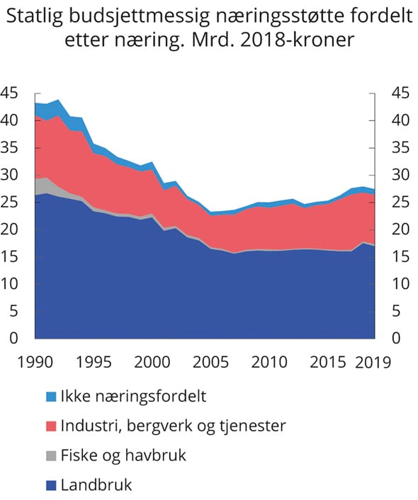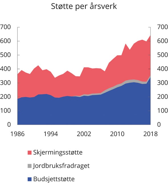 Figur 5.7 viser at skjermingsstøtten utgjør en betydelig del av støtten til jordbruket. Det totale støttenivået var relativt stabilt frem til 2007, men deretter økte støttenivået frem til 2016. Fallet fra 2016 til 2017 skyldes i hovedsak redusert skjermingsstøtte som følge av valutakursendringer, stigende verdensmarkedspriser på melk og meieriprodukter, samt fallende innenlandske priser på sauekjøtt. I 2018 økte budsjettstøtten markant, i hovedsak som følge av utbetaling av vel 1,6 mrd. kroner i erstatninger etter fjorårets tørke.