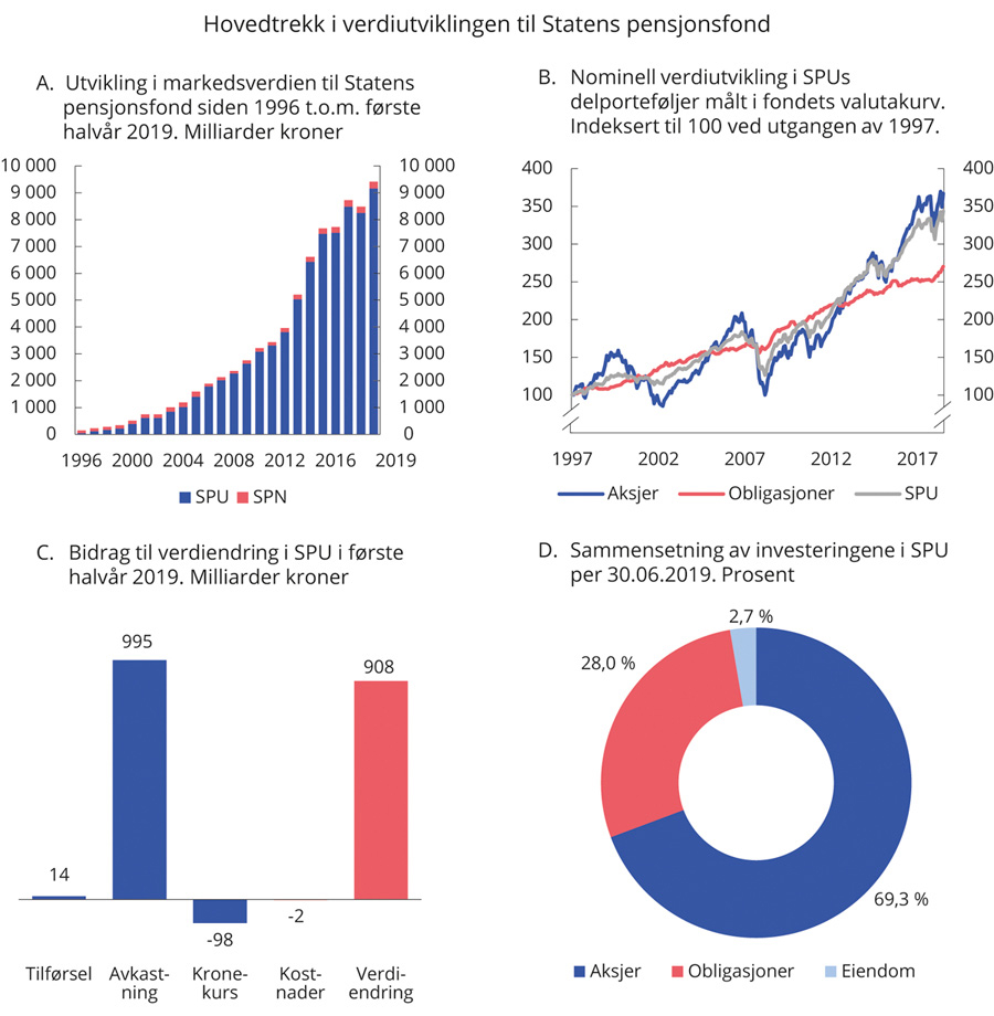Markedsverdien av SPU ved utgangen av første halvår 2019 var 9 160 mrd. kroner. Det er en økning på 908 mrd. kroner siden inngangen til året. Investeringene var fordelt med 69,3 pst. i aksjer, 28,0 pst. i obligasjoner og 2,7 pst. i unotert eiendom. Den samlede avkastningen i første halvår var 12,3 pst. målt i fondets valutakurv og før fradrag for forvaltningskostnader. Avkastningen av fondets aksje-, obligasjons- og unoterte eiendomsportefølje var henholdsvis 15,6 pst., 6,0 pst. og 2,5 pst. Målt i norske kroner var samlet fondsavkastning i første halvår 10,9 pst. En noe lavere avkastning i norske kroner enn i fondets valutakurv skyldes at kronen styrket seg mot valutakurven i perioden. Det er avkastningen av investeringene målt i valutakurven som er relevant for utviklingen i fondets internasjonale kjøpekraft.