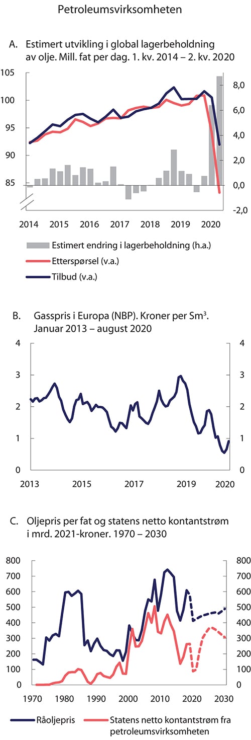 Oljeprisen har tatt seg en del opp og har den siste tiden ligget rundt 40 dollar per fat. Under oljemarkedskollapsen mot slutten av april var oljeprisen nede i under 20 dollar per fat. Produksjonskutt fra OPEC og andre oljeprodusenter har bidratt til å redusere tilbudsoverskuddet og øke oljeprisen. Prisene i terminmarkedet kan tilsi at markedsaktørene venter en noe høyere oljepris fremover, se figur 2.2 B. Oljeprisen anslås nå klart høyere enn i RNB20, mens gassprisen anslås lavere selv om den i september hadde hentet igjen store deler av fallet fra i vår og var nær nivået fra januar. Nedjusteringen av gassprisanslaget må ses i sammenheng med høyere tilbud av flytende naturgass (LNG) i Europa enn ventet.