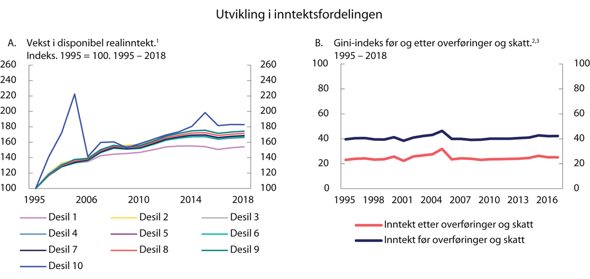 De siste 25 årene har inntektene for norske husholdninger økt med nærmere 70 pst. Generelt er den målte inntektsulikheten lavere i Norge enn i mange andre land.5 Inntektsulikheten er imidlertid høyere i dag enn den var på midten av 1990-tallet. Fra 1995 og frem til 2000 økte inntektene blant de rikeste (øverste desil) nesten dobbelt så raskt som medianinntekten, se figur 2.12A. Etter 2000 har bildet endret seg, og inntektene i midten har økt raskere enn inntektene til den rikeste tidelen. Inntektene til de som er nederst i inntektsfordelingen, (laveste desil) har på sin side vokst mindre enn medianinntekten også etter årtusenskiftet. De siste årene har de fleste husholdninger opplevd et fall i disponibel realinntekt, blant annet som følge av lav nominell inntektsvekst og høyere prisvekst etter oljeprisfallet i 2015. Forskjellig inntektsutvikling har bidratt til at Gini-indeksen har økt fra om lag 23,1 i 1995 til om lag 25,1 i 2018, se figur 2.12B.