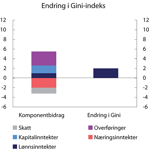Figur 2.13 viser hvordan utviklingen i ulike inntektsarter har bidratt til endringer i inntektsfordelingen. Utviklingen i kapitalinntekter har bidratt til å trekke opp inntektsulikheten i perioden 1995–2018. I 2018 utgjør kapitalinntektene både en større andel av husholdningenes samlede inntekter, og de er også blitt mer konsentrert blant de rikeste. Lønnsinntektene er blitt noe jevnere fordelt over denne perioden. Denne effekten oppveies imidlertid av at lønn utgjør en mindre andel av husholdningenes inntekter i 2018 enn i 1995, slik at den samlede utviklingen i lønnsinntektene i perioden trekker ulikheten opp. Utviklingen i næringsinntektene har isolert sett bidratt til å trekke ulikheten ned. Det skyldes at næringsinntekter både utgjør en mindre andel av husholdningenes samlede inntekter i 2018 enn i 1995, og at gjenværende næringsinntekt fordeles jevnere i 2018 enn i 1995.7 Stønadene fordeles noe jevnere i befolkningen i 2018 enn i 1995. Det innebærer at overføringssystemet virker mindre utjevnende i dag enn det gjorde for om lag 25 år siden. Skattesystemet har på sin side blitt mer omfordelende og trekker dermed ulikheten litt ned.