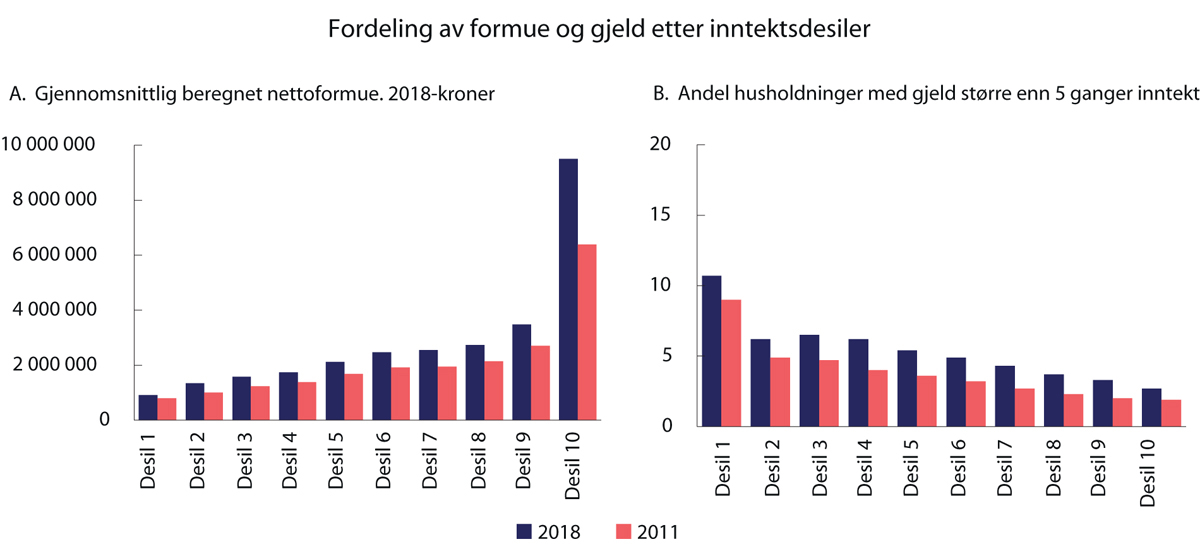 Skjevfordelingen av kapitalinntektene gjenspeiler i hovedsak at formuesfordelingen er skjev, se figur 2.14A. Det gjelder særlig eierskap i næringsvirksomhet, som aksjer mv. Boligformue er den største formueskomponenten og er jevnere fordelt enn annen formue. Som omtalt i kapittel 2.5 har norske husholdningers gjeld i lang tid vokst raskere enn inntektene. Som det fremgår av figur 2.14B, er gjeldsgraden i lavinntektshusholdningene særlig høy.