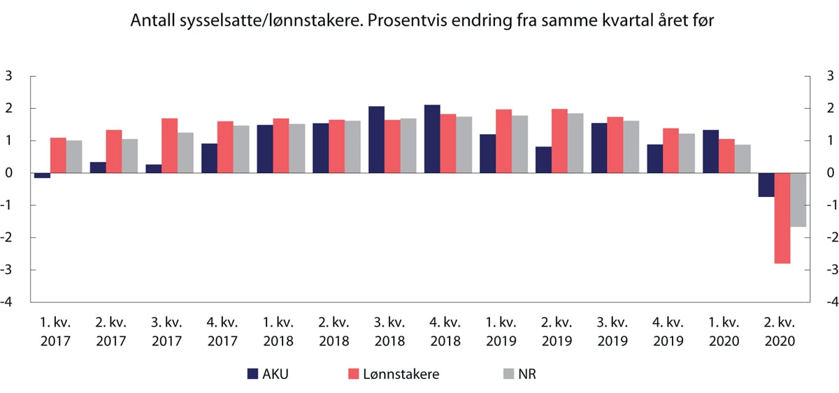 Statistikkene skal måle sysselsetting i litt forskjellige befolkningsgrupper. Mens AKU skal fange opp sysselsatte som er bosatt i Norge, skal lønnstakere fra Antall arbeidsforhold og lønn også omfatte utenlandske arbeidstakere på korttidsopphold i Norge. Sysselsettingstallene i Nasjonalregnskapet skal dekke personer som bidrar til bruttonasjonalproduktet for Norge, og inkluderer i likhet med AKU også selvstendig næringsdrivende. Statistikken for antall arbeidsforhold og lønn viste at det var et særlig stort fall i sysselsatte på korttidsopphold i 2. kvartal. Det var om lag 18 000 færre lønnstakere på korttidsopphold i 2. kvartal 2020 enn på samme tid i fjor. Denne nedgangen er med på å forklare hvorfor AKU-sysselsettingen ikke har falt like mye som sysselsettingen i de to andre statistikkene.