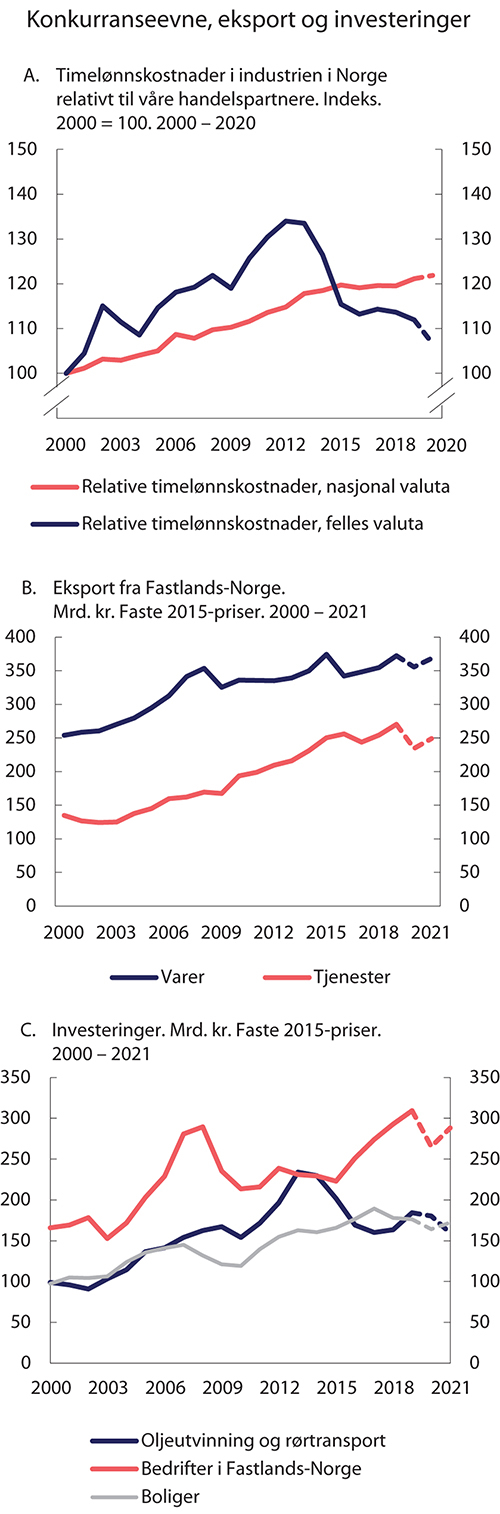 Mens aktiviteten i mange næringer har økt i takt med høyere innenlandsk forbruk og gradvis mildere smitteverntiltak, er andre hardt rammet av lavere etterspørsel fra utlandet. For store deler av industrien er situasjonen fremdeles vanskelig, og det var en markert nedgang i industriproduksjonen fra 1. til 2. kvartal i år. Mens leverandørindustrien merker sterk etterspørselsnedgang fra norsk og internasjonal petroleumsvirksomhet, har produksjonen i næringsmiddelindustrien tatt seg noe opp som følge av økt etterspørsel fra norske husholdninger. I eksportrettede virksomheter vil fallet kunne tilta i styrke etter hvert som lavere etterspørsel i landene rundt oss slår inn for fullt i bedriftenes ordrebøker. Da vil bedringen i konkurranseevnen komme godt med, se figur 2.3A. Eksporten av varer fra fastlandet falt markert i 1. halvår, se figur 2.3B. Nedgangen var bredt basert, men det var særlig svak utvikling i eksporten av verkstedprodukter og raffinerte oljeprodukter.