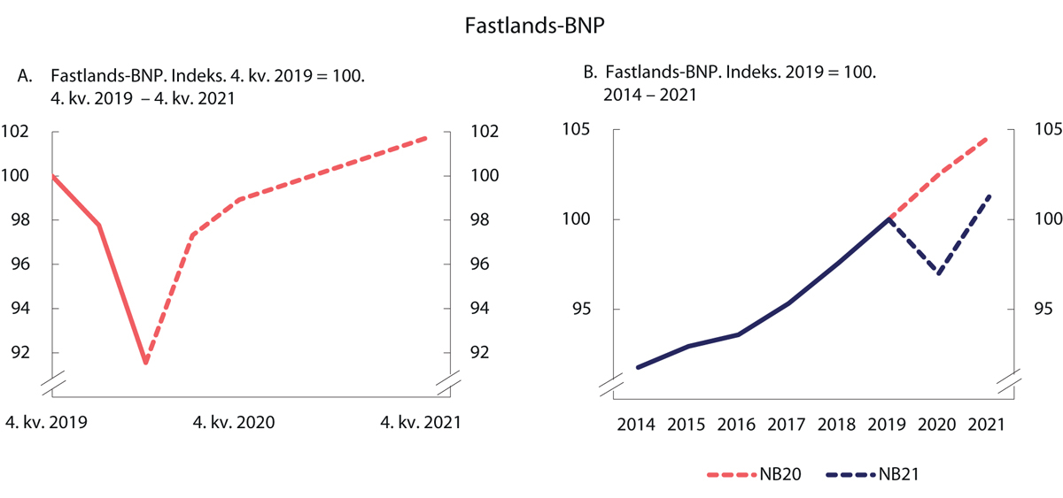 Mens kapasitetsutnyttelsen i norsk økonomi så ut til å være nær et normalt nivå før utbruddet av koronaviruset, er det nå mye ledige ressurser i økonomien. I takt med at etterspørselen øker, både her hjemme og blant våre handelspartnere, ventes kapasitetsutnyttelsen å ta seg opp igjen. I løpet av våren neste år ventes aktiviteten å være tilbake på nivået før virusutbruddet, se figur 2.4A. Aktiviteten anslås likevel å ligge på et lavere nivå neste år enn anslått i fjor høst, se figur 2.4B, og vil i flere år fremover trolig ligge lavere enn om krisen ikke hadde inntruffet. Dette understreker risikoen for langvarige kostnader som følge av pandemien.
