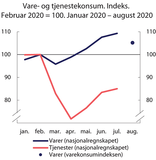 Det private forbruket falt markert i ukene etter at Norge stengte ned i mars. Siden har det innenlandske forbruket tatt seg opp. Særlig stor oppgang har det vært i konsumet av varer, som til tross for fall i august fortsatt var om lag 5 pst. høyere enn i februar, ifølge SSBs varekonsumindeks. For mat- og drikkevarer var økningen på om lag 14 pst. i samme periode. Noe av oppgangen i forbruket av varer har kommet på bekostning av tjenestekonsumet, se figur 2.5. Restaurantbesøk er blitt erstattet av matlaging for mange og har gitt økt omsetning i dagligvareforretningene. Restriksjoner på grensehandel har også trukket opp innenlandsk forbruk av varer. Tjenestekonsumet har tatt seg noe opp etter hvert som de strengeste smitteverntiltakene er blitt opphevet, og i sommer har også økningen i antall nordmenn på ferie hjemme i Norge trukket opp. Likevel var tjenestekonsumet i juli 15 pst. lavere enn i februar, ifølge nasjonalregnskapet.