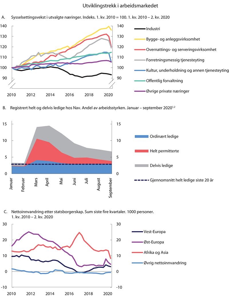 Koronapandemien har gitt det dypeste tilbakeslaget i norsk økonomi i etterkrigstiden. Krisen er ulik andre kriser, og den videre utviklingen er usikker. Norsk økonomi er fortsatt sterkt preget av pandemien og de strenge smitteverntiltakene som ble innført her hjemme og i resten av verden. Samtidig er gjeninnhentingen i gang. Husholdningene har økt sitt forbruk, produksjonen har tatt seg opp igjen siden i vår, og bedrifter har kalt tilbake mange av de permitterte. Tallet på helt arbeidsledige er mer enn halvert siden toppen i mars, fra et svært høyt nivå. Boligprisene er høyere enn før virusutbruddet.