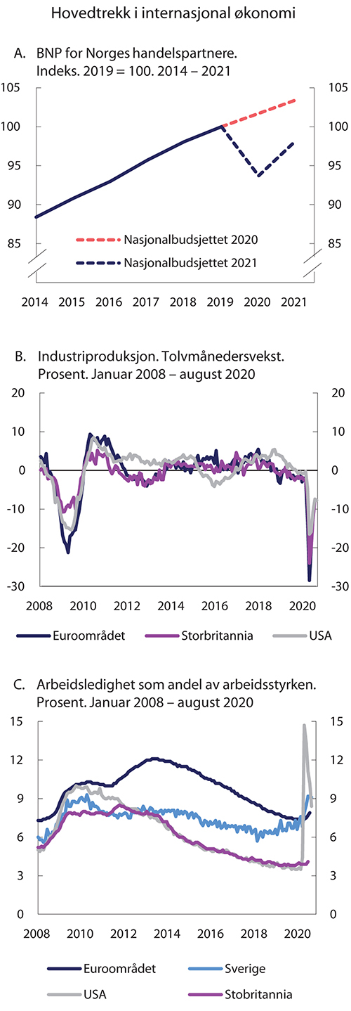 Etter en internasjonal økonomisk nedgang som savner sidestykke i nyere historie, har også den økonomiske aktiviteten ute steget i takt med avviklingen av de strengeste smitteverntiltakene. Samtidig har mange europeiske land nylig opplevd en forverret smittesituasjon. Smittevern vil fortsatt være hovedverktøyet for å bekjempe spredningen av viruset inntil en vaksine er tilgjengelig. Det vil dempe tempoet i det økonomiske oppsvinget. Aktiviteten hos våre handelspartnere anslås nå å falle med 6,3 pst. i år, mot 6 pst. i Revidert nasjonalbudsjett 2020 (RNB20). Hovedbildet fra flere prognosemakere er likevel at aktiviteten fra nå av vil ta seg markert opp igjen, og både OECD og IMF ser nå noe lysere på den økonomiske utviklingen i år enn de gjorde i juni. Utviklingen i internasjonal økonomi er nærmere omtalt i kapittel 2.3.