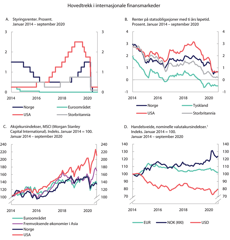 Sentralbanker verden over har satt styringsrentene ned og økt sine kjøp av verdipapirer betydelig for å sørge for tilstrekkelig likviditet i markedet og begrense økningen i lånekostnader. Tiltakene har vært svært omfattende og har trolig bidratt til at flere toneangivende børser tok seg opp gjennom våren og sommeren. De siste ukene har markedsuroen tiltatt noe igjen, og flere børsindekser har falt. Finansmarkedene er nærmere omtalt i kapittel 2.4.