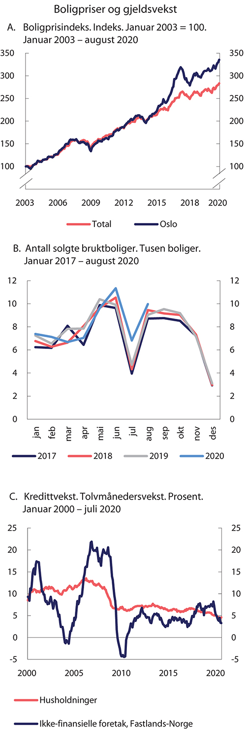 Etter å ha steget moderat gjennom mesteparten av 2018 og 2019, falt boligprisene etter virusutbruddet i mars og april, se figur 2.9A. Boligprisene tok seg imidlertid raskt opp igjen, og allerede i mai var fallet hentet inn. Prisveksten har fortsatt gjennom sommeren, og på landsbasis var prisene i august 2,2 pst. høyere enn i februar. Fallet var størst i Oslo, men Oslo har deretter hatt den høyeste prisveksten. Prisene i Oslo var i august 3 pst. høyere enn i februar. Lave utlånsrenter er trolig den viktigste årsaken til den relativt høye veksten gjennom sommeren.