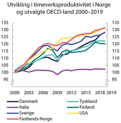 Siden den globale finanskrisen har produktiviteten i Norge og andre tradisjonelle industriland økt i lavere tempo enn før, se figur 5.1. I Fastlands-Norge falt veksten i arbeidsproduktiviteten, som viser forholdet mellom bruttoprodukt og timeverk, fra rundt 2,6 pst. i perioden 1998–2007 til 0,7 pst. i perioden 2008–2019. Tilbakeslaget i fastlandsøkonomien etter utbruddet av covid-19 har gått sammen med lavere produktivitet i fastlandsøkonomien, da verdiskapingen har falt mer enn timeverkene. Utbruddet bidrar dessuten til usikkerhet om utviklingen fremover. Verdensbanken har sett på erfaringer fra de landene som ble hardest rammet av virussykdommene SARS, MERS, ebola og zika, og fant varige, negative effekter på investeringer og arbeidsproduktivitet. Også erfaringen fra andre økonomiske kriser er at de kan ha langvarige, negative virkninger på arbeidsproduktiviteten. Både i Norge og i andre OECD-land ventes investeringene i næringsvirksomhet å gå kraftig ned i 2020. Dersom realinvesteringene forblir på et lavt nivå over lang tid, slik mange europeiske land har opplevd etter finanskrisen, kan farten i den organisatoriske og teknologiske utviklingen gå ned.