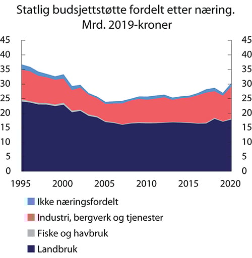 Figur 5.7 viser at skjermingsstøtten utgjør en betydelig del av støtten til jordbruket. Det totale støttenivået var relativt stabilt frem til 2007, men deretter økte støttenivået frem til 2016. Fallet fra 2016 til 2017 skyldes i hovedsak redusert skjermingsstøtte som følge av valutakursendringer, stigende verdensmarkedspriser på melk og meieriprodukter, samt fallende innenlandske priser på sauekjøtt. I 2018 økte budsjettstøtten markant pga. erstatninger i forbindelse med tørken, mens budsjettstøtten falt noe i 2019.