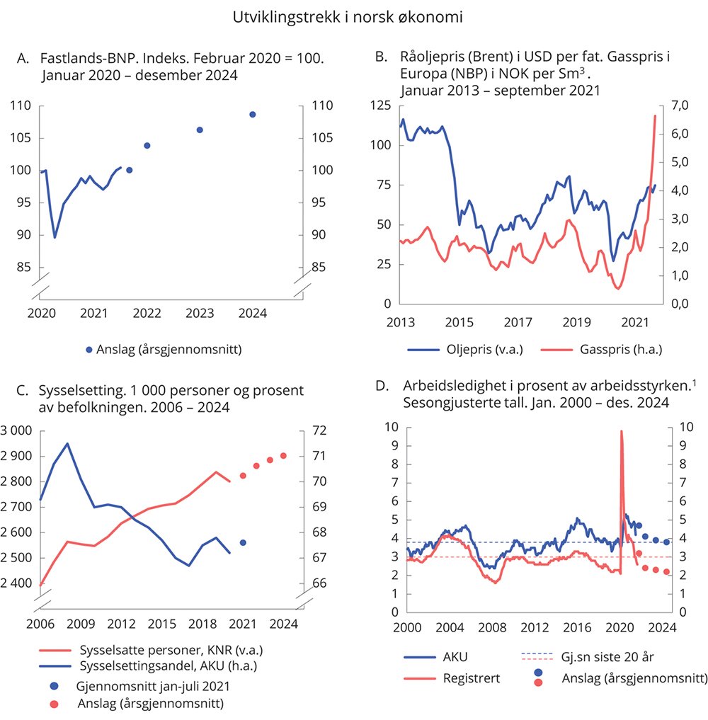 Gjenåpningen av samfunnet har gitt høy fart i norsk økonomi. Den økonomiske krisen er nå over, selv om noen bedrifter i tjenesteytende næringer, særlig i reiseliv og transport, fortsatt har utfordringer som følge av pandemien. Den registrerte arbeidsledigheten går raskt ned og er nesten tilbake på nivået fra før pandemien. Nedgangen går hurtigere enn det vi så for oss i revidert nasjonalbudsjett i mai. Samtidig vil det også i 2022 være noen ettervirkninger av pandemien. Store deler av næringslivet venter høy vekst fremover. Flere næringer opplever problemer med flaskehalser blant annet fordi det er vanskelig å få tak i kvalifisert arbeidskraft. Pandemien bidrar fortsatt til usikkerhet om den økonomiske utviklingen fremover, men tempoet i vaksineringen og høy vaksineringsgrad gjør at usikkerheten er klart mindre enn tidligere i år.