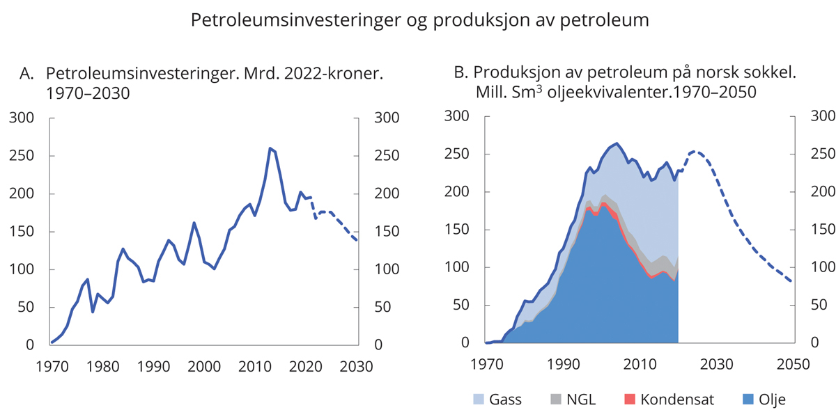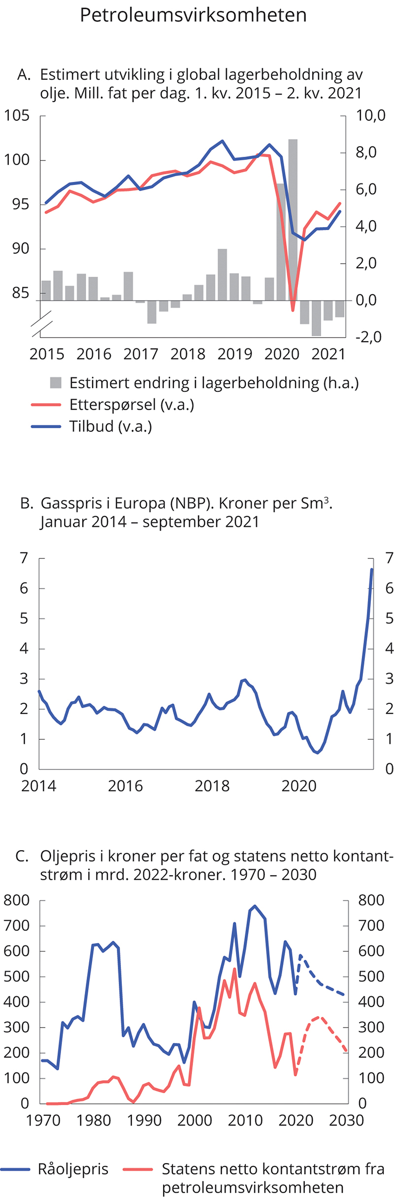 Oppgangen ute har bidratt til økt etterspørsel etter og høyere priser på råvarer. Prisen på aluminium har ikke vært høyere på ti år, en oppgang som også skyldes økte fraktrater. I begynnelsen av oktober var oljeprisen rundt 80 dollar per fat, om lag 10 dollar høyere enn da revidert budsjett ble lagt frem. Også prisene på fremtidige leveranser av olje har økt. Gassprisen i Europa har steget enda mer så langt i år, se figur 2.1B. Det må blant annet ses i sammenheng med værforhold og lavere tilbud av flytende naturgass (LNG) til Europa, se nærmere omtale i avsnitt 2.6. Petroleumsinvesteringene ventes å stige litt i år for deretter å falle i 2022. De midlertidige endringene i petroleumsbeskatningen som ble vedtatt av Stortinget i fjor, stimulerer investeringer i petroleumsvirksomheten og har gitt oljeselskapene økte muligheter til å gjennomføre planlagte investeringsprosjekter.