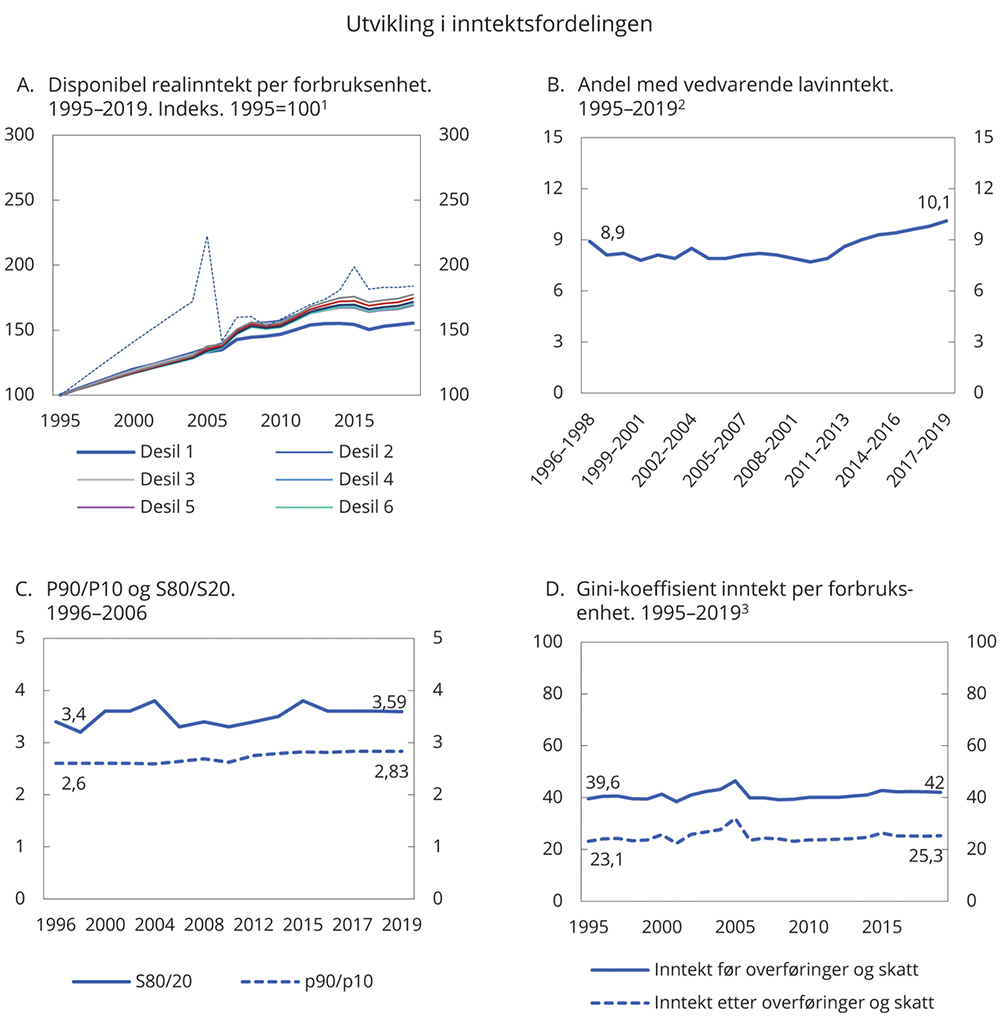 Beskrivelsene over bygger på den offisielle inntekts- og formuesstatistikken fra Statistisk sentralbyrå (SSB), som er utarbeidet på bakgrunn av skattemeldingen. Inntekts- og formuesstatistikken for pandemiårene 2020 og 2021 er ennå ikke klar. Studier fra pandemiens tidlige fase viste at personer med lav inntekt og lav utdanning ble særlig hardt rammet av pandemiens virkninger på arbeidsmarkedet.7