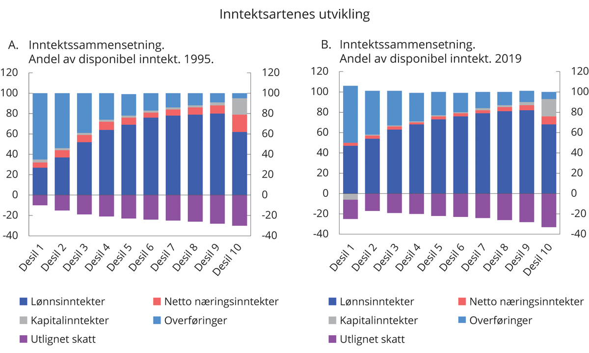 Den svakere inntektsutviklingen i 1. inntektsdesil må delvis ses i sammenheng med demografiske endringer. Innvandringen til Norge har tiltatt siden 2005, og andelen innvandrere i 1. desil har økt. Om lag 23 pst. av personene i 1. inntektsdesil hadde innvandrerbakgrunn i 2004. I 2019 var andelen om lag 50 pst. Personer med innvandrerbakgrunn, og særlig førstegenerasjons innvandrere fra fattige land, kan ha svakere forutsetninger for å delta i det norske arbeidsmarkedet, blant annet på grunn av manglende formell kompetanse og språkkunnskaper. Personer i 1. inntektsdesil har mindre utdanning og svakere yrkestilknytning enn personer i de andre inntektsdesilene. Dette gjenspeiles i figur 2.13A og 2.13B som viser at lønnsinntekter utgjør en mindre andel av inntektene i 1. inntektsdesil enn i de øvrige inntektsdesilene. Sammenlignet med de andre inntektsdesilene vil inntektsutviklingen i 1. desil være mer avhengig av vekst i overføringene. Inntektsutviklingen i 10. inntektsdesil vil på sin side være mer avhengig av utviklingen i kapitalinntektene, som er konsentrert i denne inntektsgruppen.