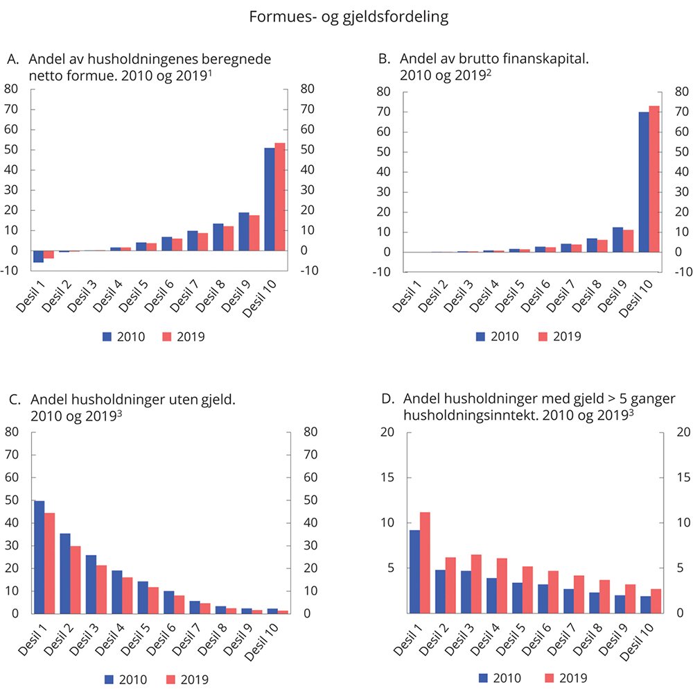 Den skjeve fordelingen av kapitalinntekter gjenspeiler i hovedsak at formuesfordelingen er skjev, se figur 2.14A. Det gjelder særlig fordelingen av finanskapital. Om lag 73 pst. av husholdningenes beregnede brutto finanskapital tilfalt 10. desil i 2019, se figur 2.14B.6 Boligformue er husholdningenes største formueskomponent. Til tross for at boligformue er jevnere fordelt enn annen formue, er det likevel betydelig skjevhet i fordelingen av denne formuen. I 2016 anslo SSB Gini-koeffisienten for total formue til 72,3, mens Gini-koeffisienten for boligformue var anslått til 60,9.