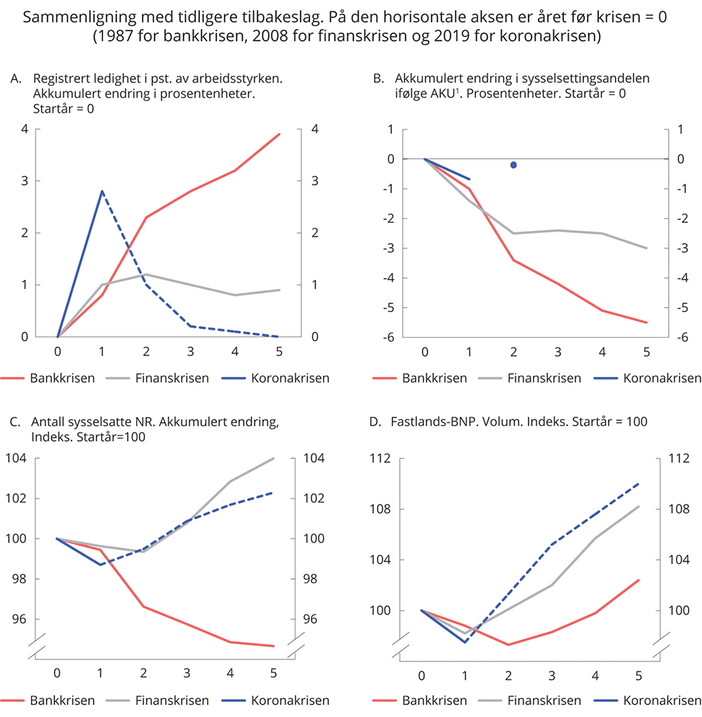 Bankkrisen fra 1987–1992 står fortsatt igjen som det lengste tilbakeslaget i norsk etterkrigshistorie. Først etter fire år var aktiviteten i norsk økonomi tilbake på nivået fra før krisen, se figur 2.15A. Sysselsettingsandelen (blant bosatte) falt sammenhengende over de fem årene tilbakeslaget varte, og to år ut i krisen var ledigheten tredoblet. Den økonomiske politikken bidro til å forsterke tilbakeslaget. Renten ble holdt høy for å forsvare kronekursen, lønnsveksten var høy, og finanspolitikken ble strammet inn frem til 1989. Boligprisene falt med om lag 40 pst. fra 1987 til 1992, korrigert for veksten i konsumprisene.